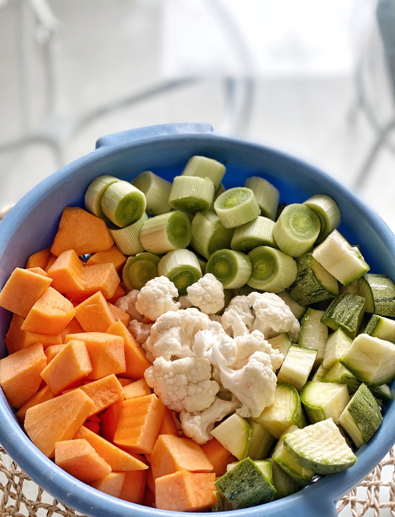 Taglia la zucca e le zucchine in cubetti di circa 1 cm. Riduci il porro a rondelle dello stesso spessore e ricava le cimette dal cavolfiore.