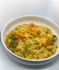 Scalda l’olio in padella e soffriggi la cipolla. Aggiungi la verdura e salta per un paio di minuti. Ricopri completamente con l’acqua e aggiungi un pizzico di sale. Copri col coperchio e cuoci per 30 minuti. Trascorso il tempo aggiungi altra acqua (regolati in base a quanta ne è stata assorbita durante la cottura) e unisci il riso. Lascia cuocere a fiamma viva secondo i minuti richiesti dal cereale scelto. Ultimata la cottura togliere la pentola dai fornelli, aggiungi il parmigiano grattugiato e procedi mantecando. Servire dopo circa mezzora.